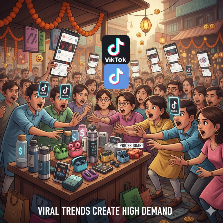 Moving over, ever notice how a viral TikTok challenge or dance suddenly causes everything around it- like fashion accessories or gadgets – to fly off the shelves? This is a clear example of demand in action. When everyone wants the latest Bluetooth earphones or smart water bottles because they’re featured in popular videos, prices for those items often shoot up. Like a busy Indian market during the holidays, there are more buyers than sellers, which drives prices up! Sellers also know this, so they raise prices because they see how prominent it is across the country.